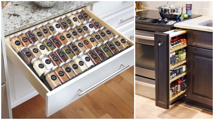 برخی از طراحان آشپزخانه پیشنهاد میکنند یک کشو را بهطور کامل به ادویه اختصاص دهید؛ طوری که ظرفها بهصورت خوابیده و با برچسب روی درپوش چیده شوند. این روش هم زیباست و هم بسیار کاربردی.