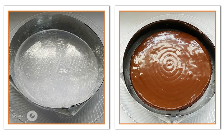 رینگ گرد را اندازه بگیرید طوری که اندازه آن یک سانت بزرگتر از اندازه کیک باشد و بعد چند دور سلفون دور رینگ بپیچید تا کاملا محکم شود.