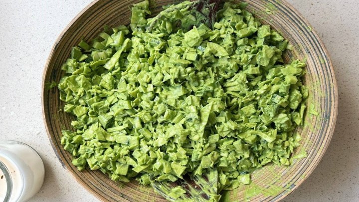 من خودم همیشه نصف آووکادو رو تو سالاد میریزم چون دوست ندارم طعم آووکادو خیلی غالب بشه و بقیه مواد دیده نشن. ولی این کاملاً سلیقهایه و شما میتونید کل آووکادو رو هم استفاده کنید تا سس غلیظتر و خامهایتر بشه. پس میتونید بسته به ذائقه خودتون مقدار آووکادو رو تنظیم کنید.