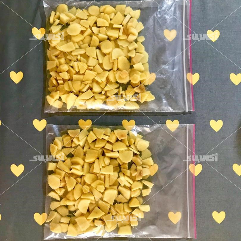 نکته: حتماً هوای درون کیسه پلاستیکی را بهطور کامل بگیرید و اگر میخواهید زنجبیل را به صورت درسته و کامل فریز کنید، بهتر است نخست دور آن فویل آلومنیومی بپیچید. این کار با جلوگیری از نفوذ مقداری آب در بافت کلی زنجبیل، ماندگاری عطر و طعم آن را تا مدتی طولانی میسر میکند. برای تکههای خرد شده نیازی به انجام این کار نیست.