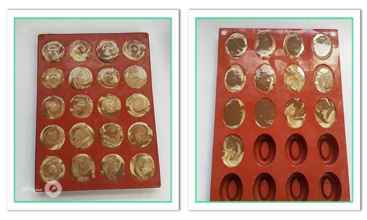 نکته بسیار مهم در این حلوا این است که موقع ریختن حلوا داخل قالب باید سرعت عمل داشته باشید چون شکلات داخل مواد اگر زیاد خنک شود حلوا در نهایت شکل براقی پیدا نمی کند و رنگ آن مات و کدر میشود.