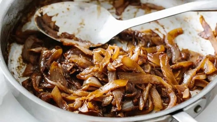 زمانی که پیازها شروع به چسبیدن به کف تابه کردند، باید حرارت را به کمترین حد ممکن برسانید. در این مرحله، هم زدن بیش از حد پیازها مانع از کاراملی شدن آنها میشود، بنابراین بهتر است آنها را زیاد هم نزنید.