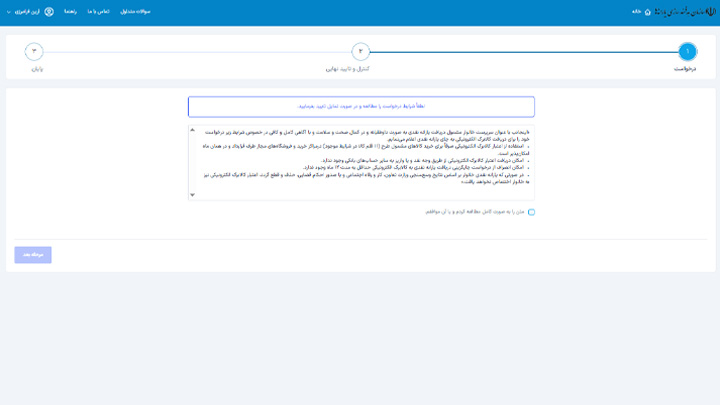 در مرحله نهایی، متن توافقنامه و شرایط استفاده از کالابرگ به شما نمایش داده میشود. پس از مطالعه دقیق، تیک مربوط به پذیرش قوانین را بزنید و درخواست خود را نهایی کنید.