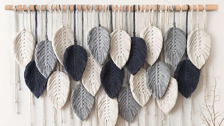 استفاده از مکرومه‌های ساده یا رنگی یکی دیگر از ایده‌های تزیین دیوار پذیرایی با وسایل ساده است که می‌تواند جلوه‌ای خاص به فضای منزل ببخشد. می‌توانید از این مکرومه ها برای قسمت بالای نشیمن، بالای تخت یا دیوار راهروی منزل استفاده کنید.